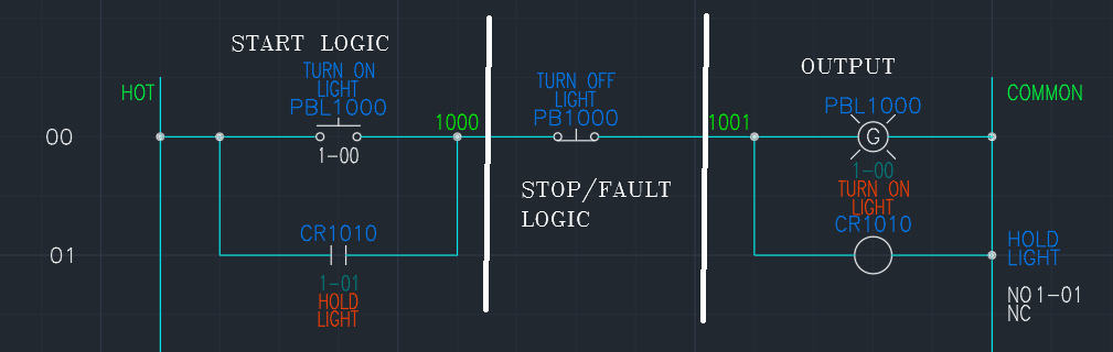 The stop/fault area of the circuit, are things that will cause the circuit to fail. The TURN OFF LIGHT button is our only thing we have in this circuit, but we could have multiple buttons to turn off the light or some other logic that we could use to turn off the light.