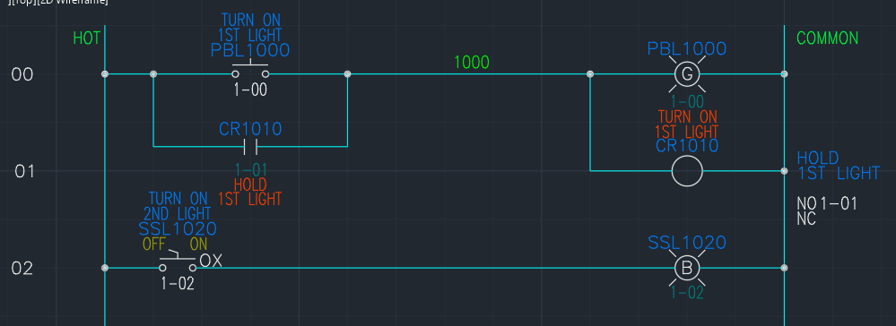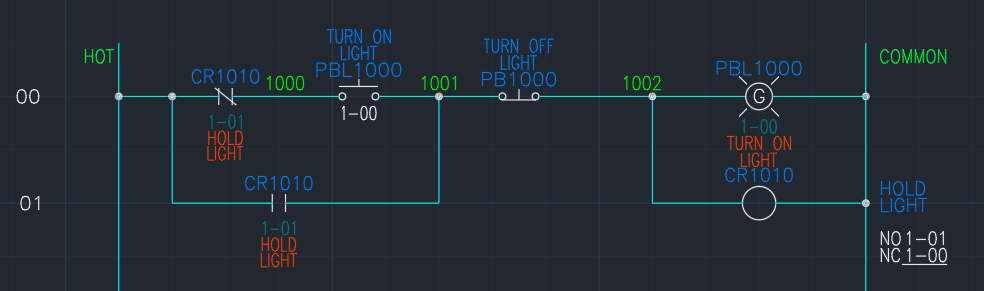 When the coil is energized, the NO contacts are active and the NC contacts are inactive. In our example above, CR1010, has an NO contact branched around the the push button. When we push our TURN ON 1ST LIGHT button, it will turn on the light and activate the relay. The relay’s contacts close and hold the circuit on. Unfortunately, we cannot turn the light off. Once it is on, it is on. This is bad design. Our selector switch allows us turn off the light.