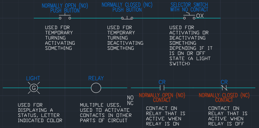 Relays are extremely common in control circuits. They also come in multiple flavors, Single-Pole Double-Throw (SPDT), Double-Pole Double-Throw (DPDT), Triple-Pole Double-Throw (3PDT) being the most common. Relays work by energizing a coil to switch contacts. In a relay’s off state, the normally open (NO) contacts are inactive and the normally closed (NC) contacts are active.