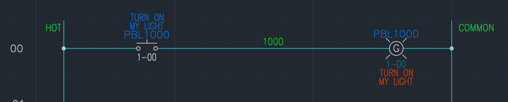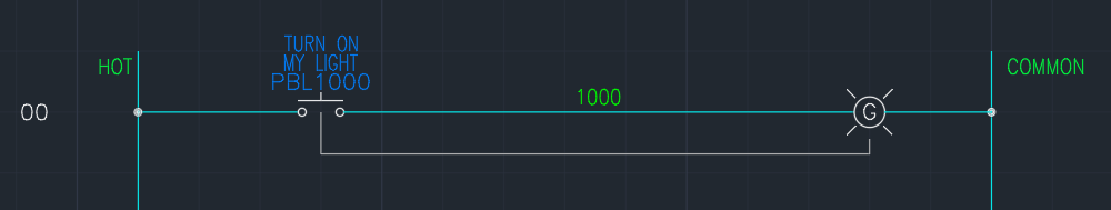 Both mean the same thing. One uses a references while another uses a line to show they are connected. Now looking the push button, there is no indicator what color it is. A system that is designed correctly will have all the buttons and lights labeled. There will multiple buttons and lights of the same color on them. Labels make sure we know what they do. So there would be a button on the panel that is labeled “TURN ON MY LIGHT” that illuminates itself green. Button will more than likely have a green lens color due to the color to display. But you do not want to push the button all the time turn on the light. You want it to stay on until you turn it off.