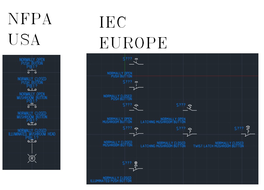 To start, depending on where you live in the world, there are different symbols used in electrical panel schematics. The United States uses NFPA symbols while Europe uses IEC. With companies being global nowadays, it is not uncommon to see machines using prints from different regions. I will be focusing on NFPA due to the fact I am located in the United States. They are also a lot easier to get started to read. An E-Stop button on machine is a Normally Closed Mushroom Head Button. There is one symbol in NFPA, even if it is latching like it is. In IEC we could have up to four different symbols for an E-Stop. I did not include a Keyed Latching Normally Closed Mushroom Button. Learning to read prints, you really do not want to get bogged down in the small details like what kind of mushroom button it is. What is going to happen we start designing circuits going through the symbols that are used.